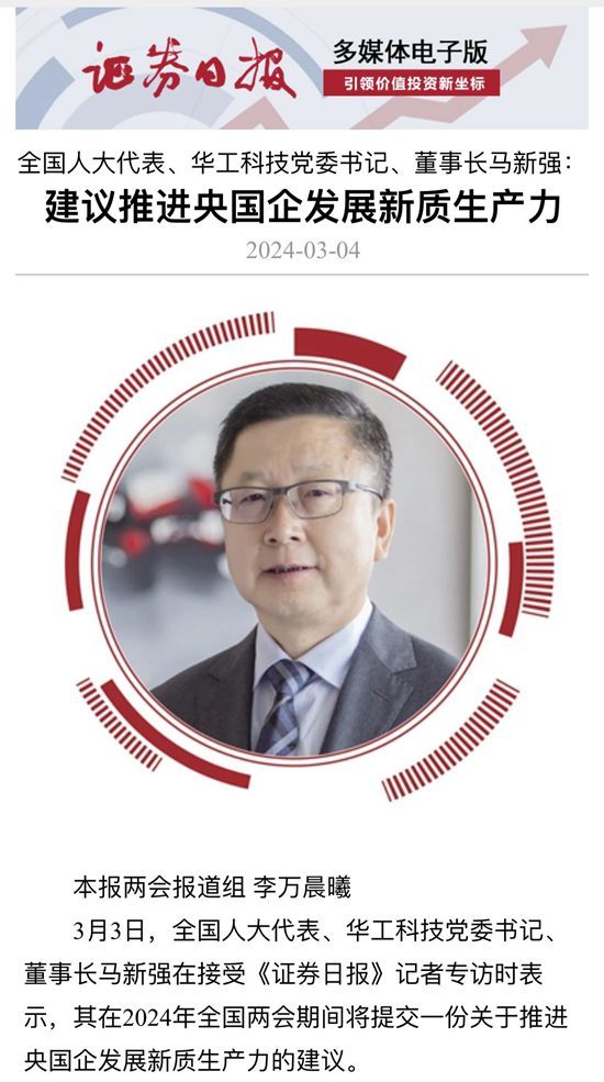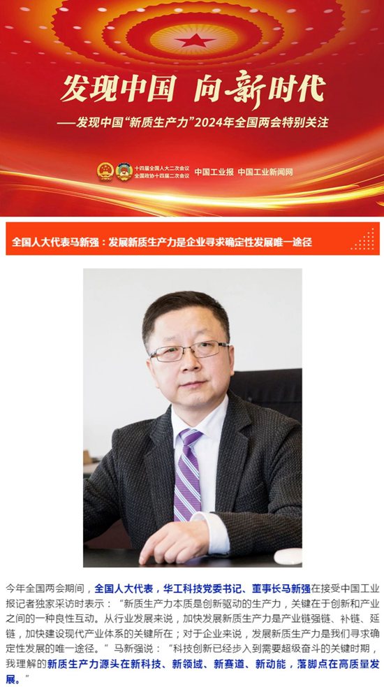 人民日報、新華社、中央電視臺、經濟日報、科技日報、新華網、工業和信息化部宣傳中心、人民郵電報、中國工業報、中國經濟網、證券時報、證券日報、上海證券報、21世紀經濟報、經濟觀察報、湖北日報、極目新聞、長江日報等多家媒體關注馬新強代表的履職情況及華工科技創新發展。