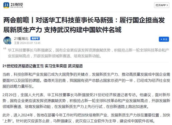 馬新強代表建議,面對新形勢,國有企業更應該發揮資源稟賦優勢,積極搶占新一輪全球科技革命和產業發展制高點,開辟發展新領域新賽道、培育發展新動能,在發展新質生產力上先行行試,在創新道路上跑出加速度。武漢應以工業軟件為主導,建設成中國軟件名城。